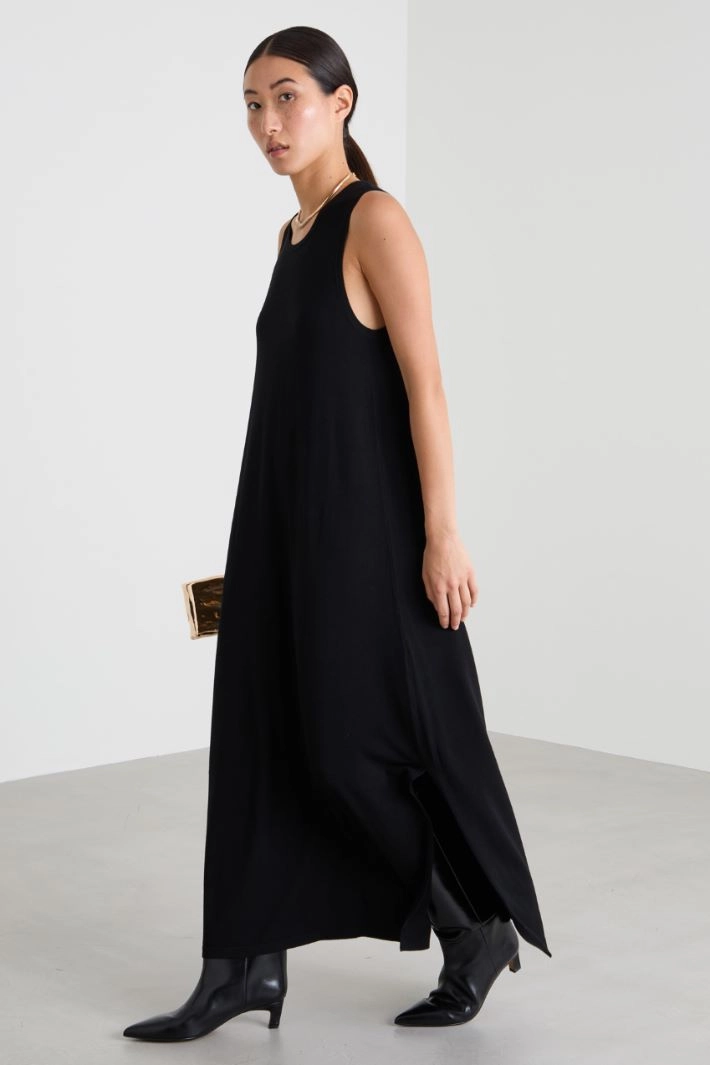 Loose-fit dress in viscose blend jersey, with round neckline, sleeveless and side slit.