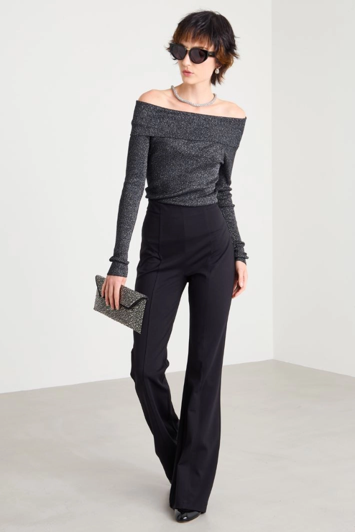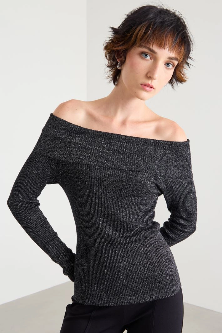 Fitted sweater in stretch viscose and lamé yarn blend, off-shoulder neck and long sleeves.