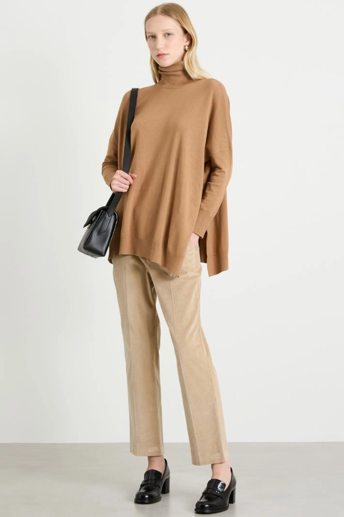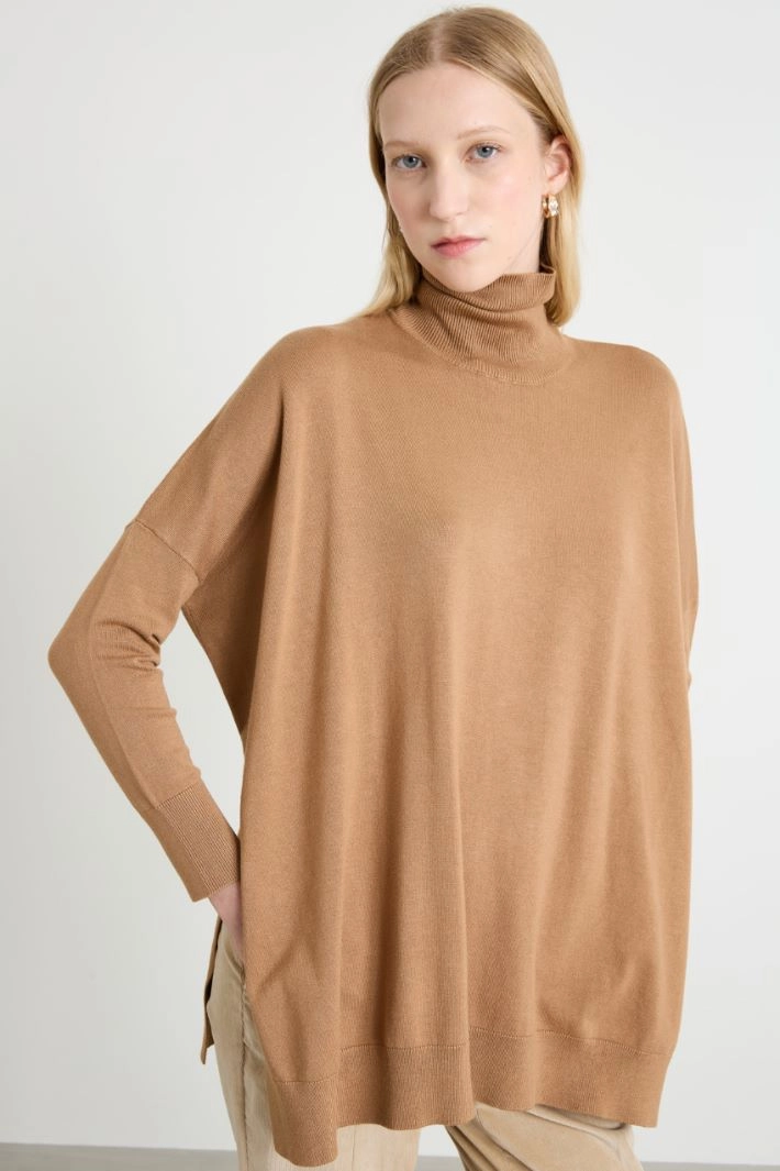 Oversized sweater in viscose blend yarn, with high turned-up neck, long dropped sleeves, side slits and asymmetrical hem. Ribbed trim.