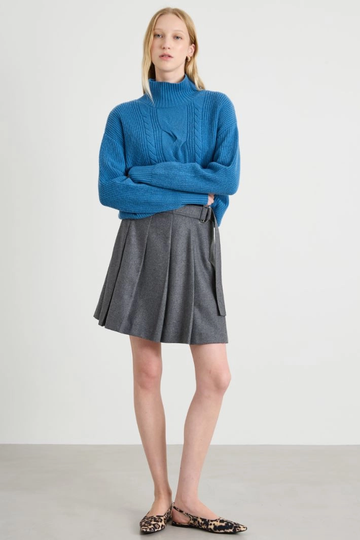 Regular-fit sweater in cable-knit wool blend yarn, with a high neck, long dropped sleeves and ribbed edges.