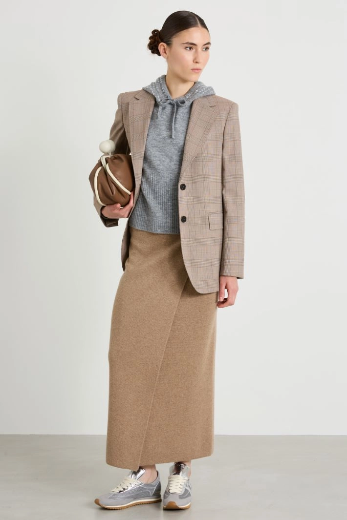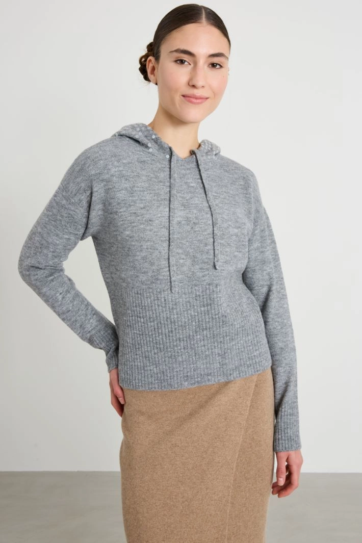 Regular-fit sweatshirt-style sweater in stretch yarn, with a hood covered in embroidered sequins and drawstring, long sleeves with dropped shoulders and high ribbed edges.