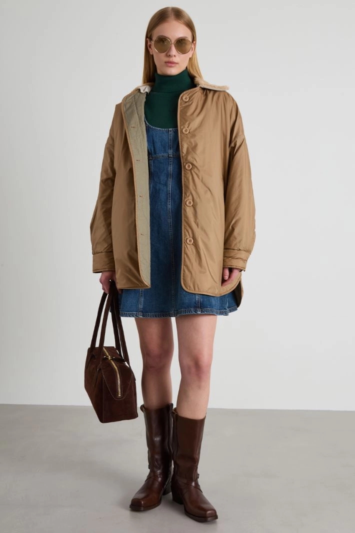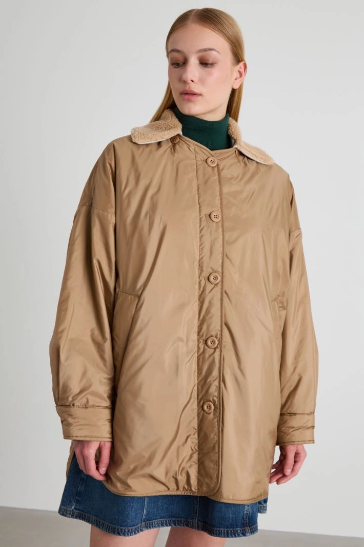 Loose-fit padded jacket in technical satin, with removable plush-effect shirt collar, long dropped-sleeves, side welt pockets and side slits. Single-breasted button fastening. Reversible model with quilted taffeta interior.