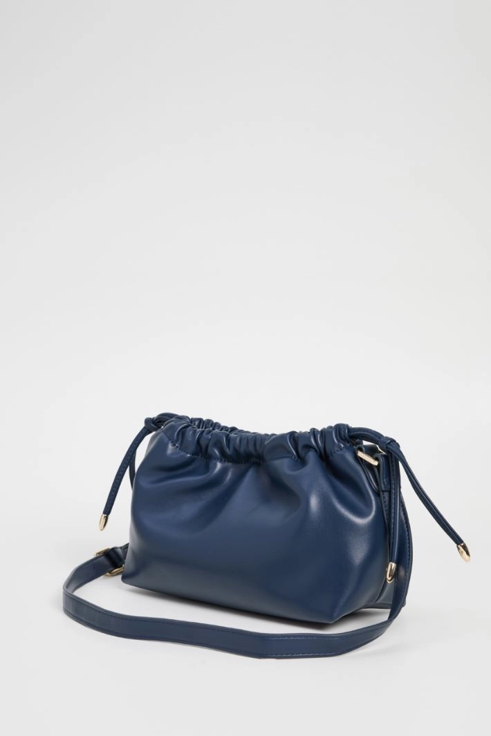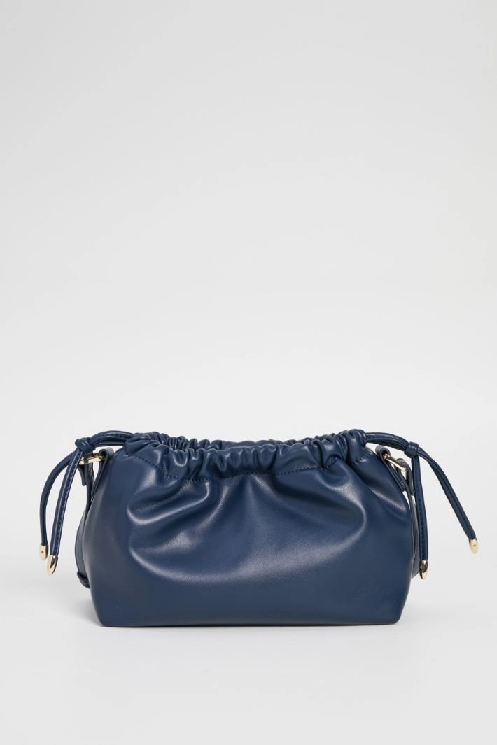 Faux leather bag with a shiny finish, an adjustable shoulder strap, closure with magnetic button, drawstring with metal ends. Lined interior with pockets.