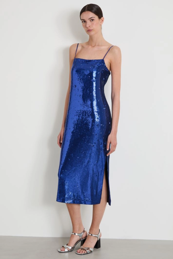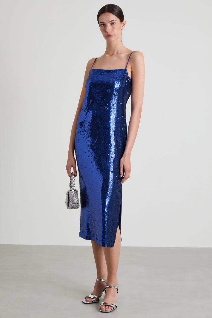 Fitted dress in jersey with all-over sequins, square neckline, thin shoulder straps and side slit at the hem.
