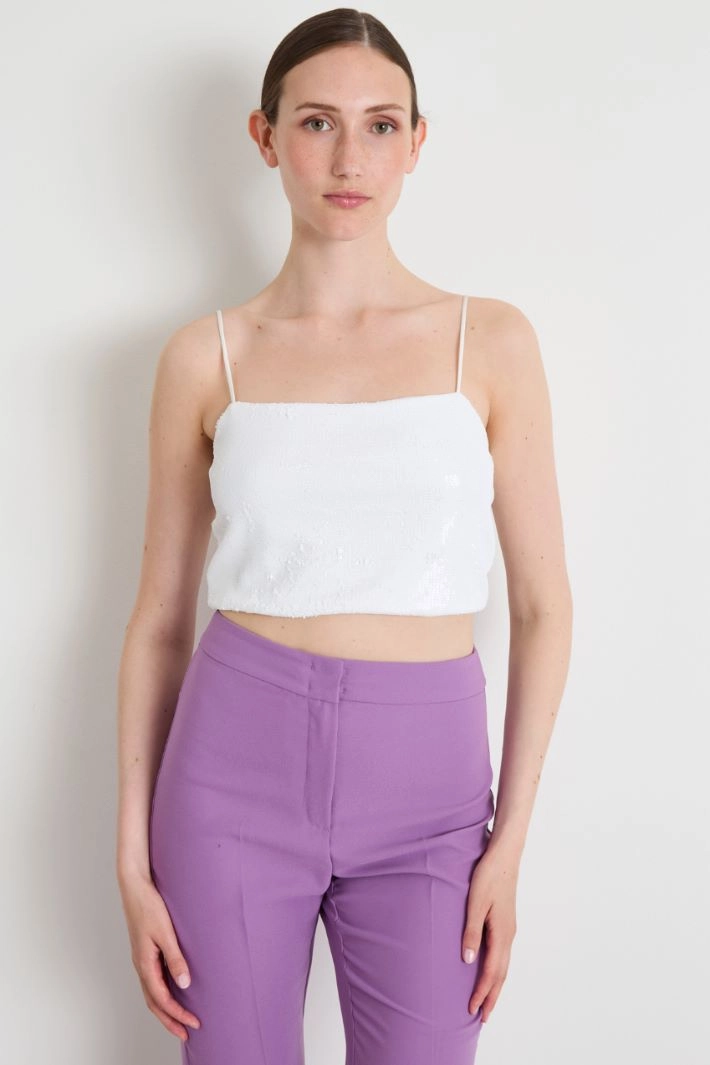 Semi-fitted cropped top in jersey with sequins, square neckline and thin shoulder straps. Lined.