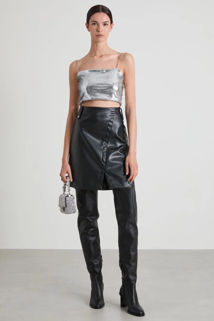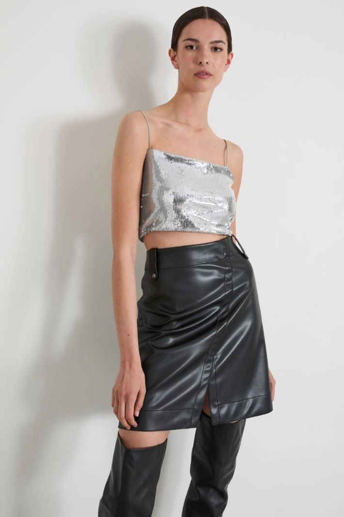 Semi-fitted cropped top in jersey with sequins, square neckline and thin shoulder straps. Lined.