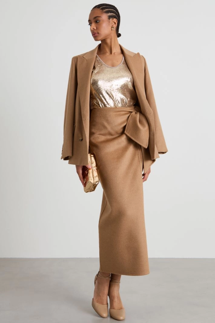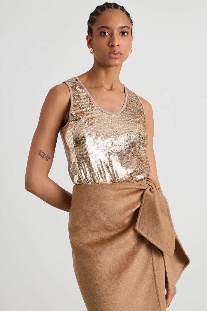 Semi-fitted top in fabric covered with matching sequins on the front, with tulle back, U-neckline and wide shoulder straps.