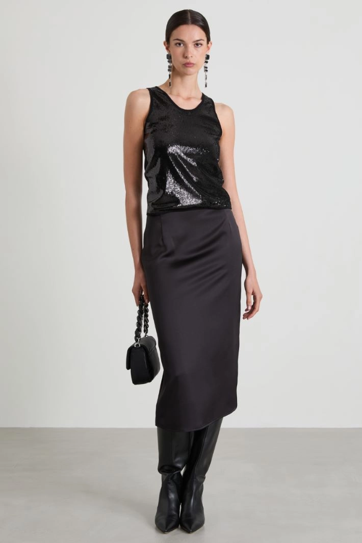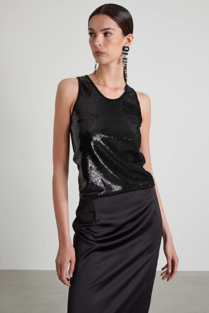 Semi-fitted top in fabric covered with matching sequins on the front, with tulle back, U-neckline and wide shoulder straps.