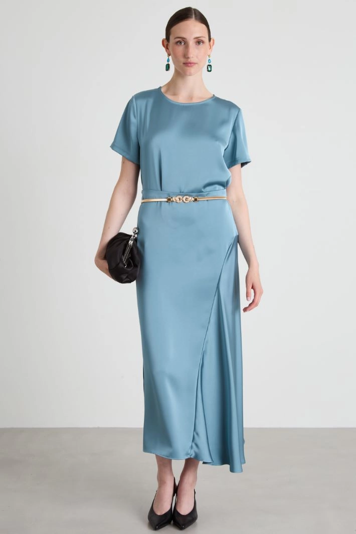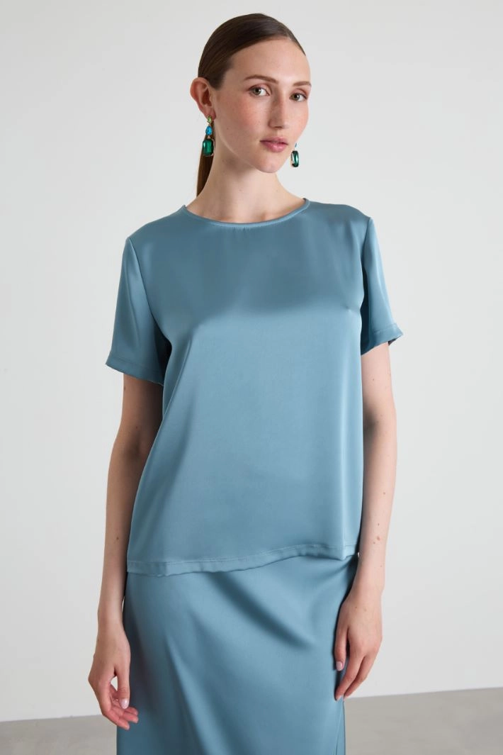 Straight-cut two-material satin top with a jersey panel cut from a blend of natural fibres and stretch viscose, with a crew neck, short sleeves and a teardrop fastening with a button.