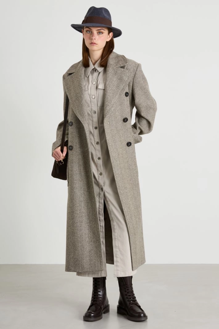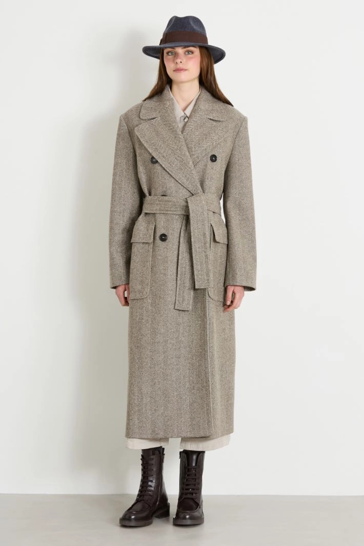Straight-fit coat in wool blend cloth finished with double stitching, with wide lapels, long sleeves, large patch pockets with flaps on the sides and a slit on the center back. Matching belt. Double-breasted fastening with buttons. Lined.