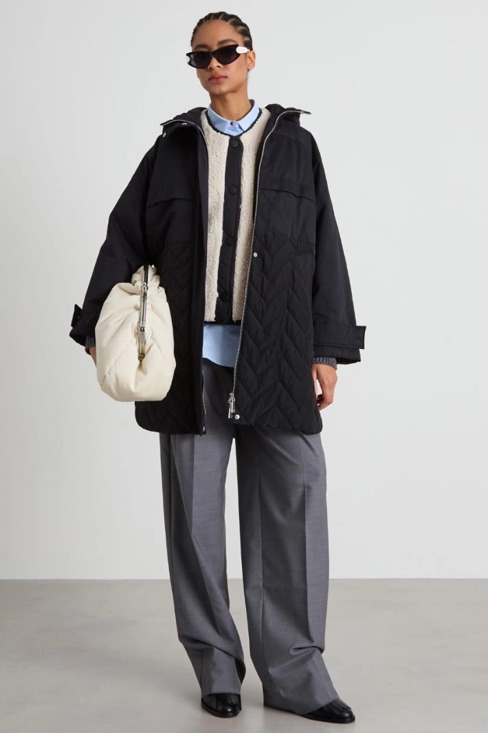 Straight-fit parka in a water-repellent cotton blend fabric, with a quilted technical insert, hood, long raglan sleeves with a wrist strap and patch pockets with a flap on the chest and side welt pockets. Concealed fastening with a double-slider zip and snap buttons. Reversible vest with a matching plush-effect interior.