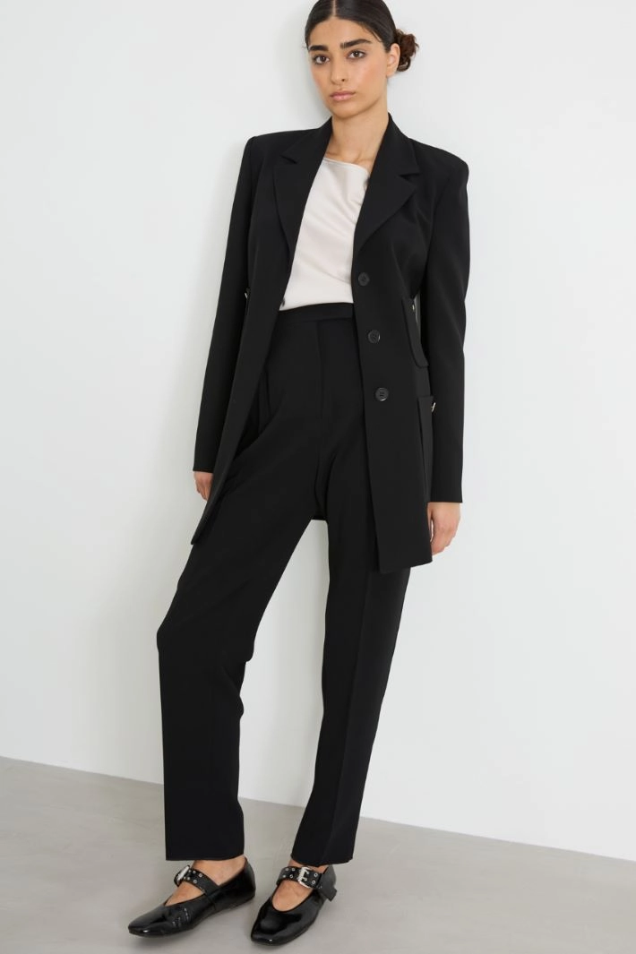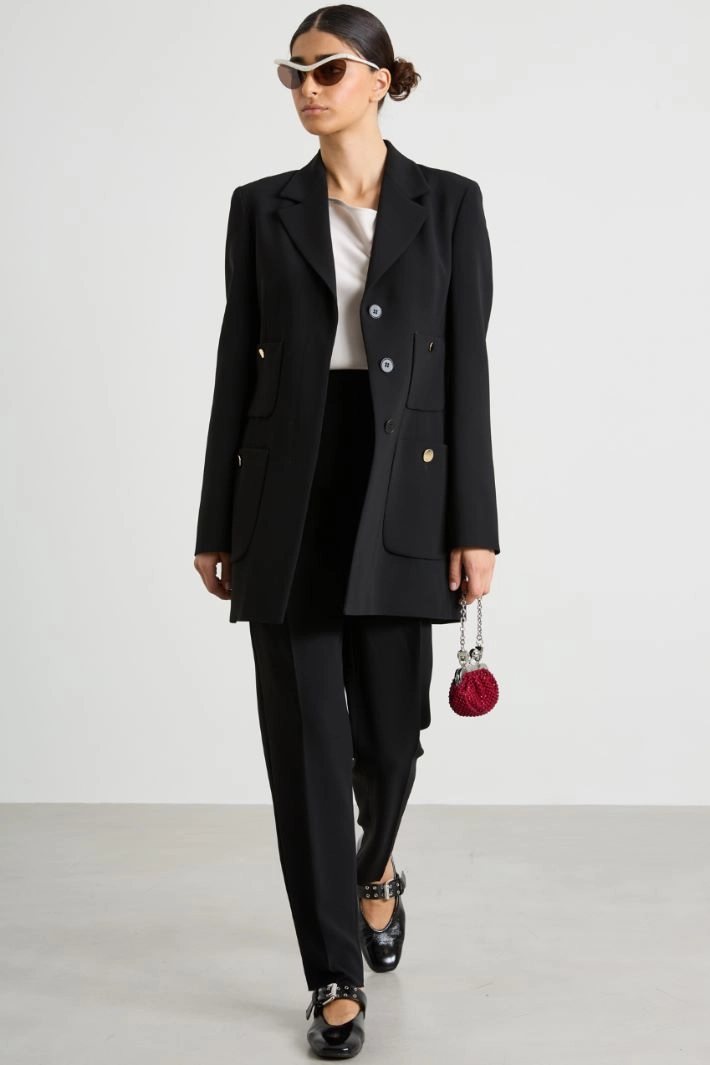 Straight-fit cady jacket with lapel collar, long sleeves with slits and patch pockets on the chest and sides. Hidden button fastening. Lined.