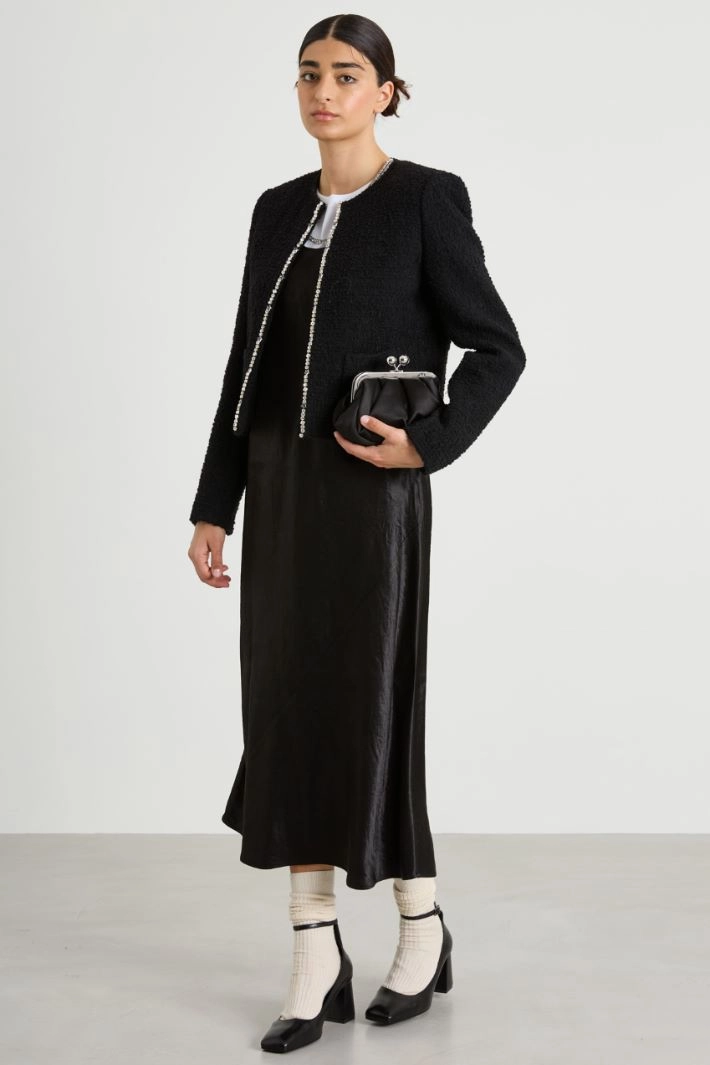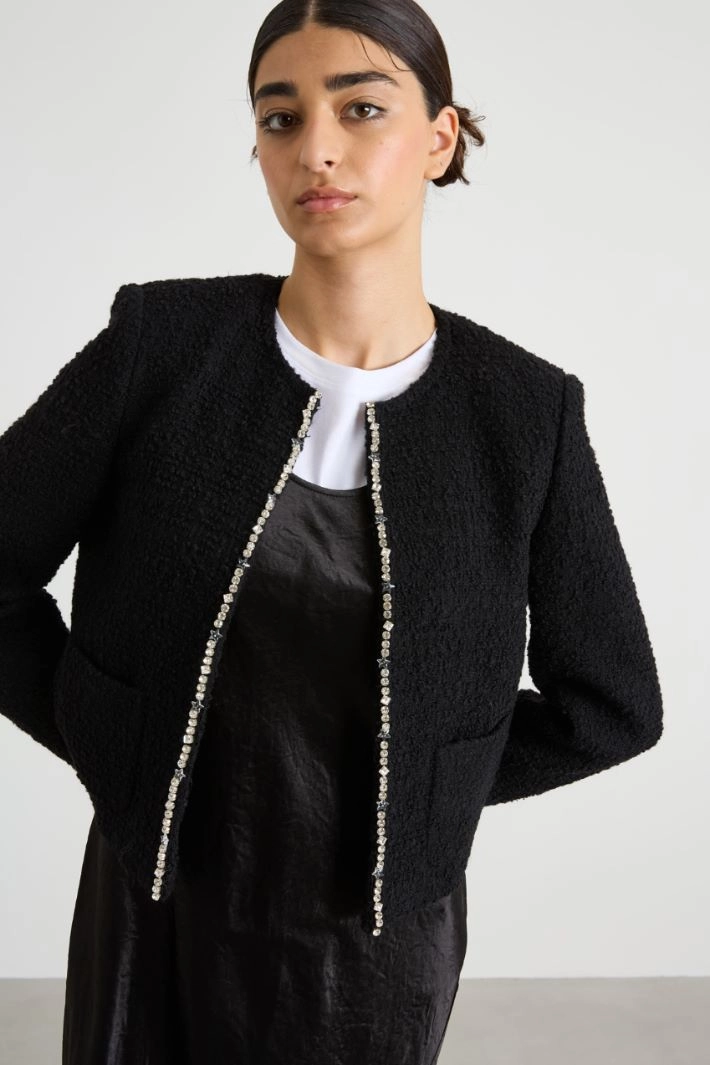 Straight-cut jacket in wool blend bouclé, with embroidered crystal detail, crew neck, long sleeves and patch pockets. Lined.