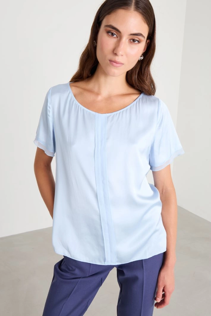 Flowing blouse in pure viscose satin, with crépon inserts, boat neckline, short sleeves and side slits at the bottom.