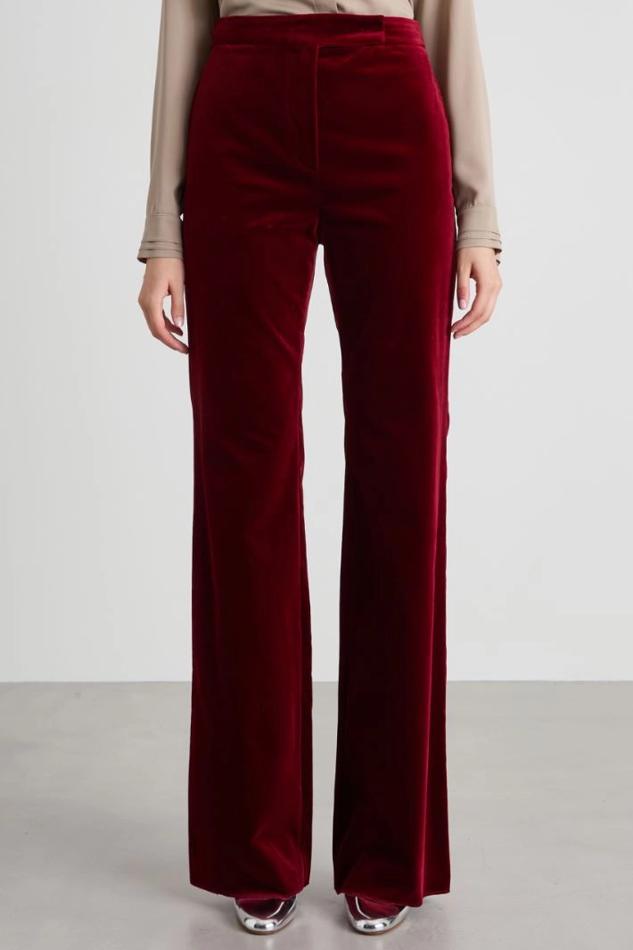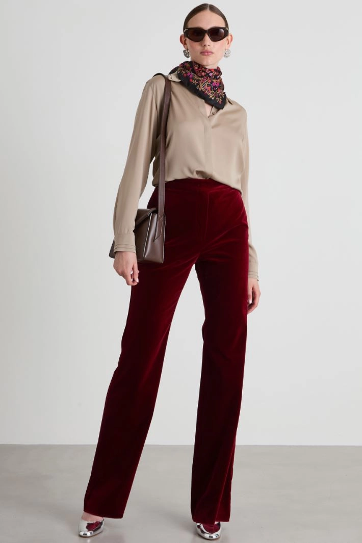 Straight-fit trousers in stretch cotton velvet, with inset side pockets and hidden fastening with zip, button and hook.