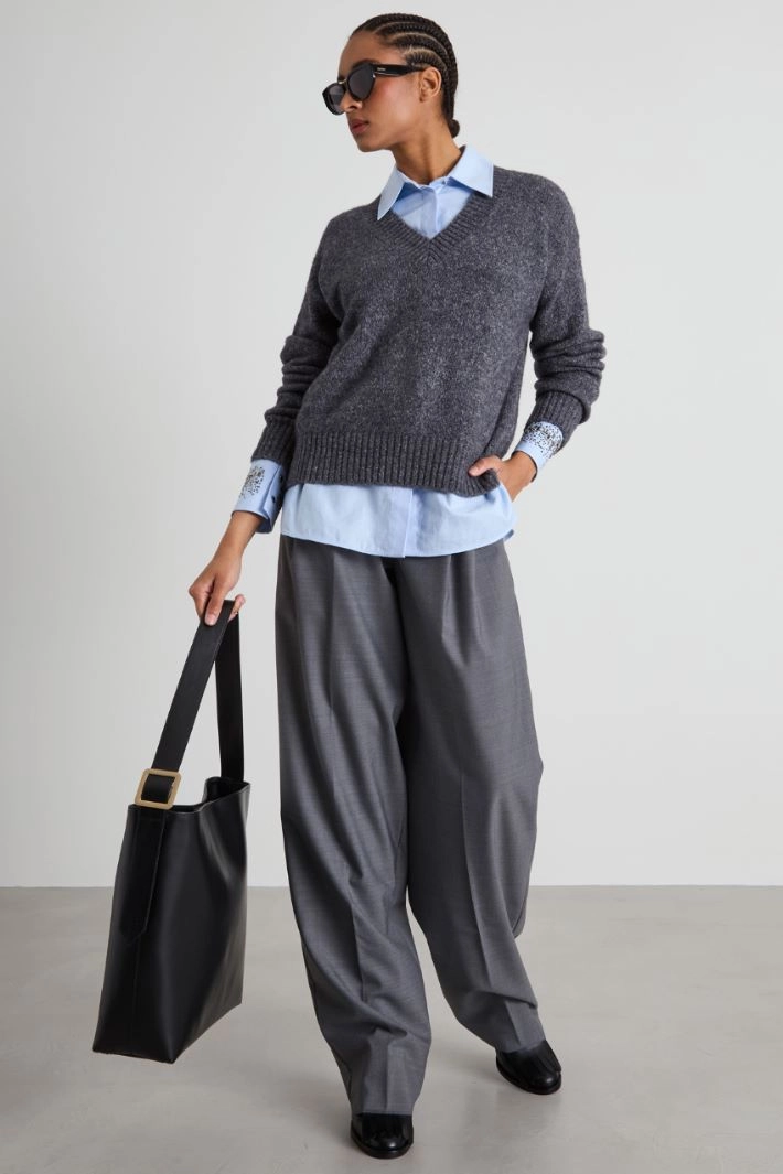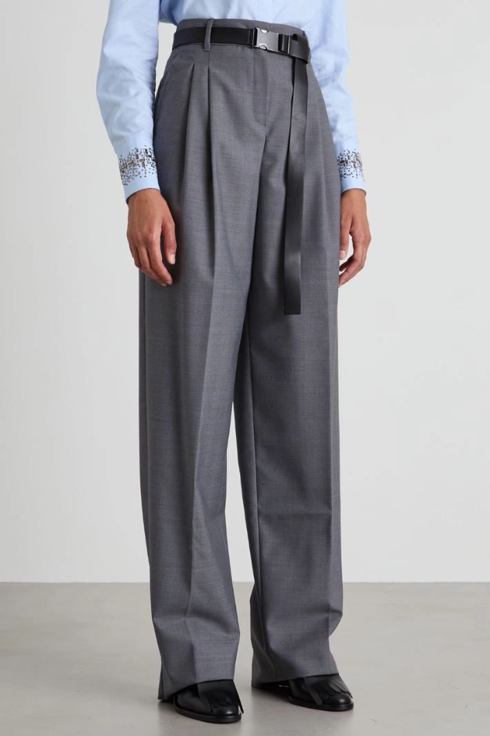 Wide-leg trousers in wool-blend gabardine, with belt loops and double pleats at the waist, French pockets and crease pressed lengthwise. Hidden fastening with zip, button and hook. Matching belt.