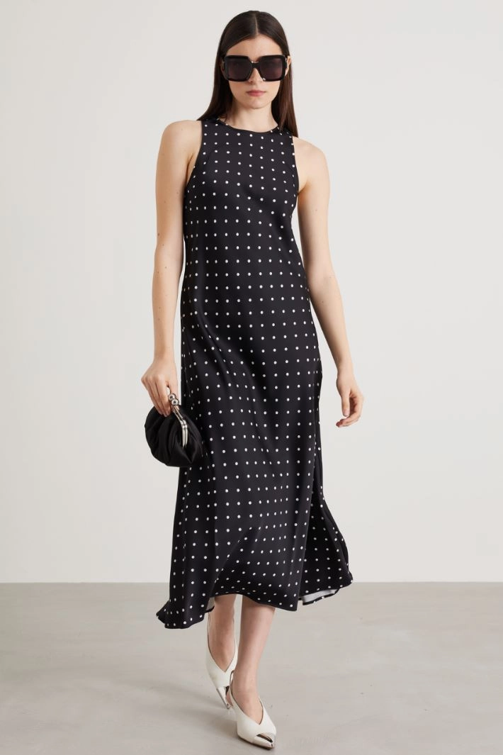 Flared and loose satin dress with round neckline and teardrop fastening with button.