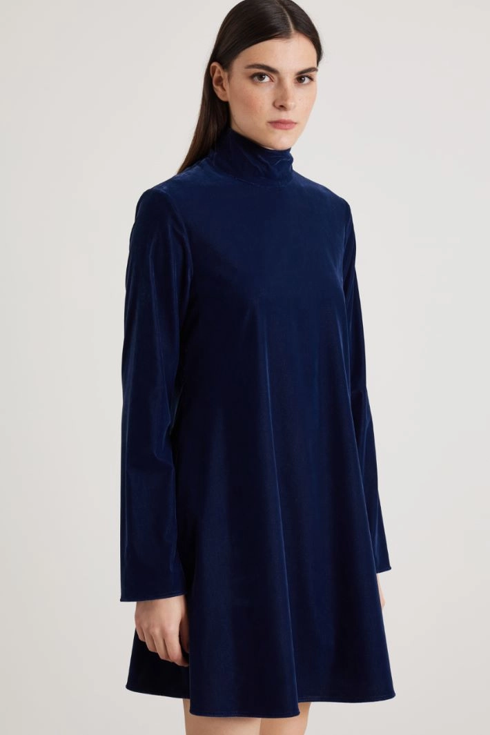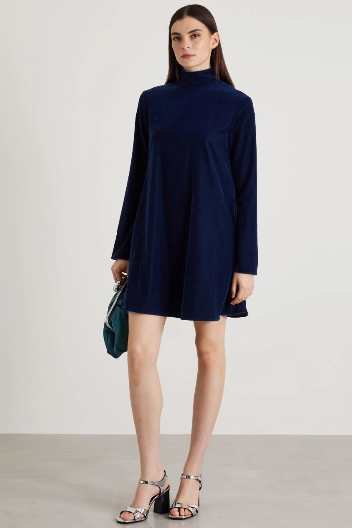Flared velvet dress with high neck, long sleeves and inset side pockets. Zip fastening on the center back.