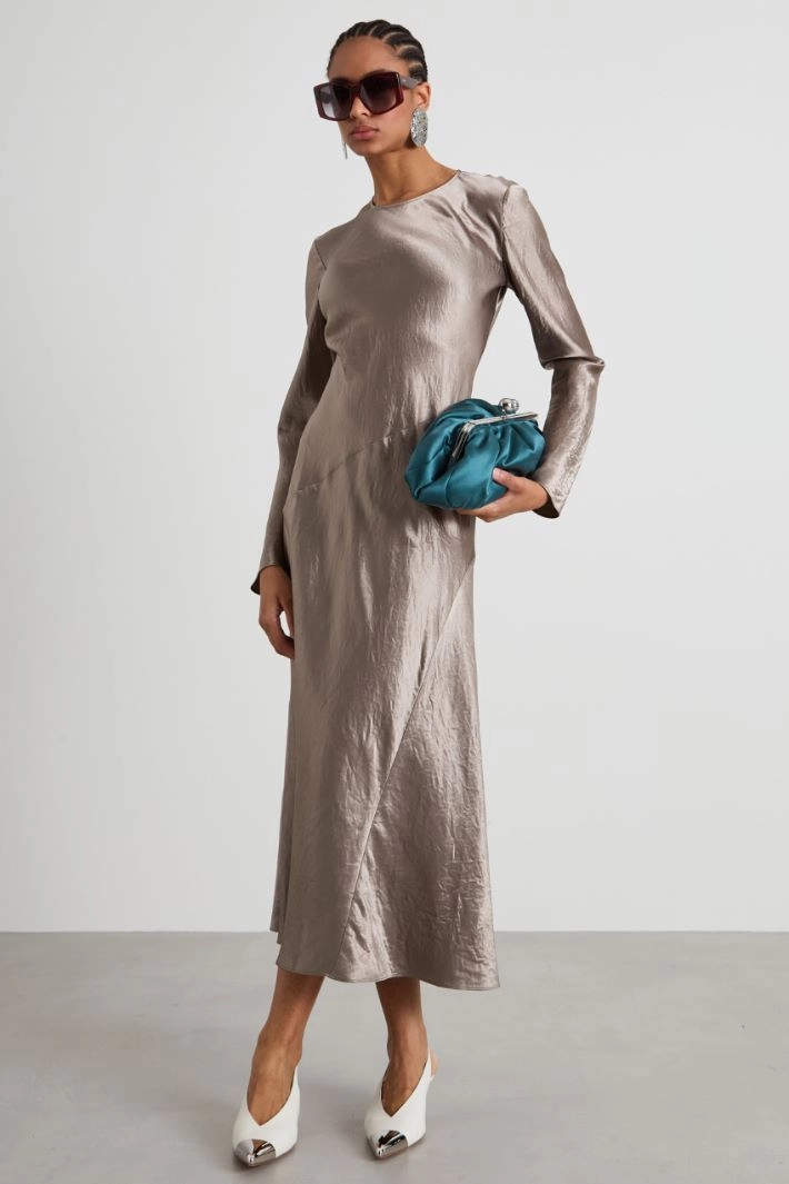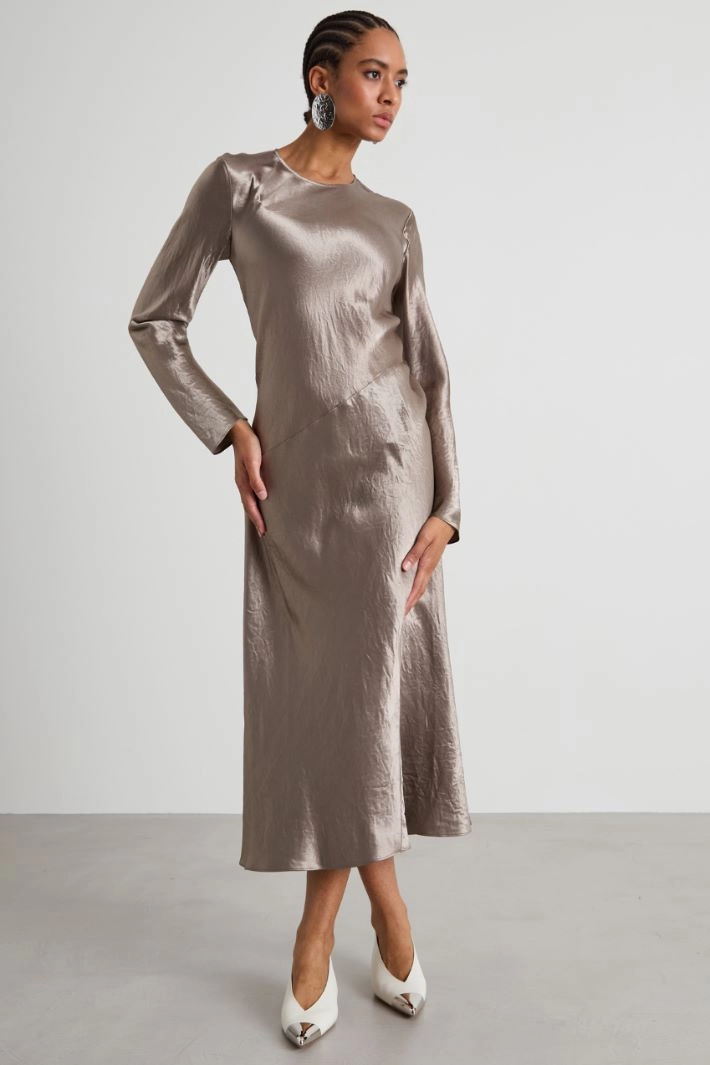 Long satin flared dress with round neckline and long sleeves. Invisible zip fastening on the back.