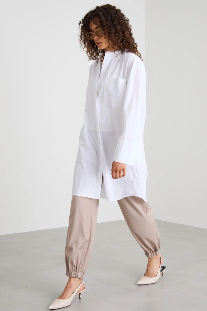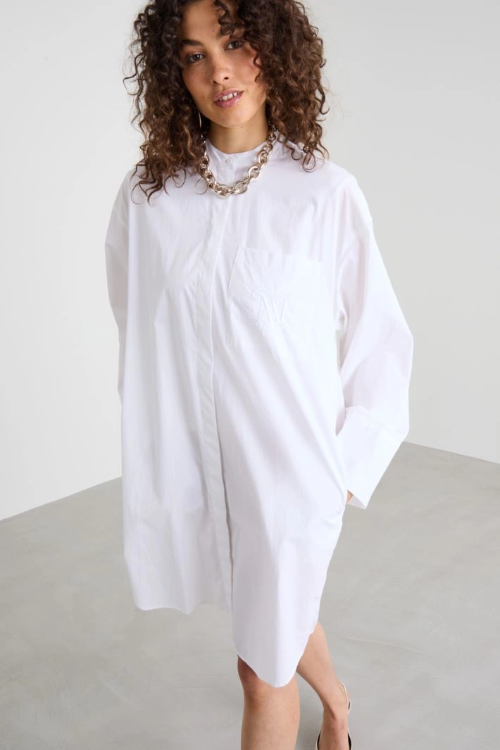 Straight-fit shirt dress in pure cotton poplin, with Mandarin collar, long sleeves with high cuff and slits, patch pockets and pockets inset in the side seams. Fastening with hidden buttons.