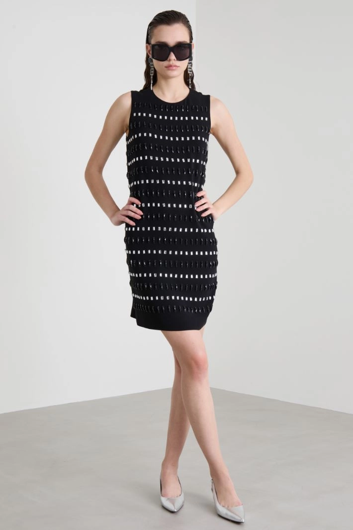 Sleeveless cady dress with a straight cut with jewel embroidery on the front and round neckline. Invisible zip fastening on the center back. Lined garment.
