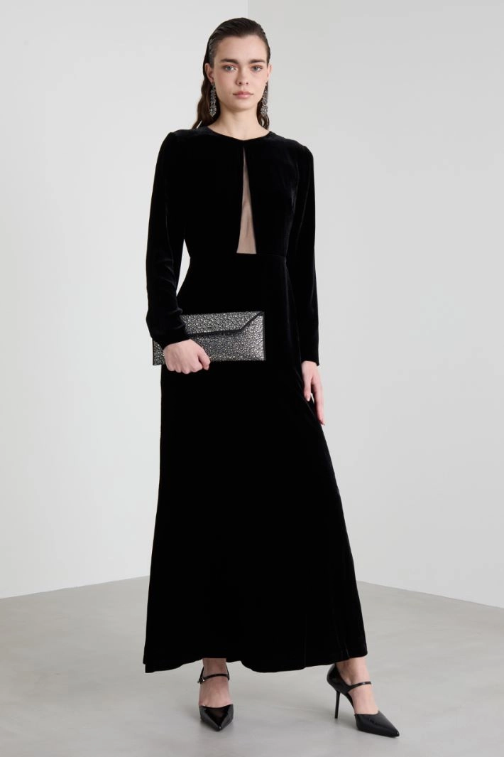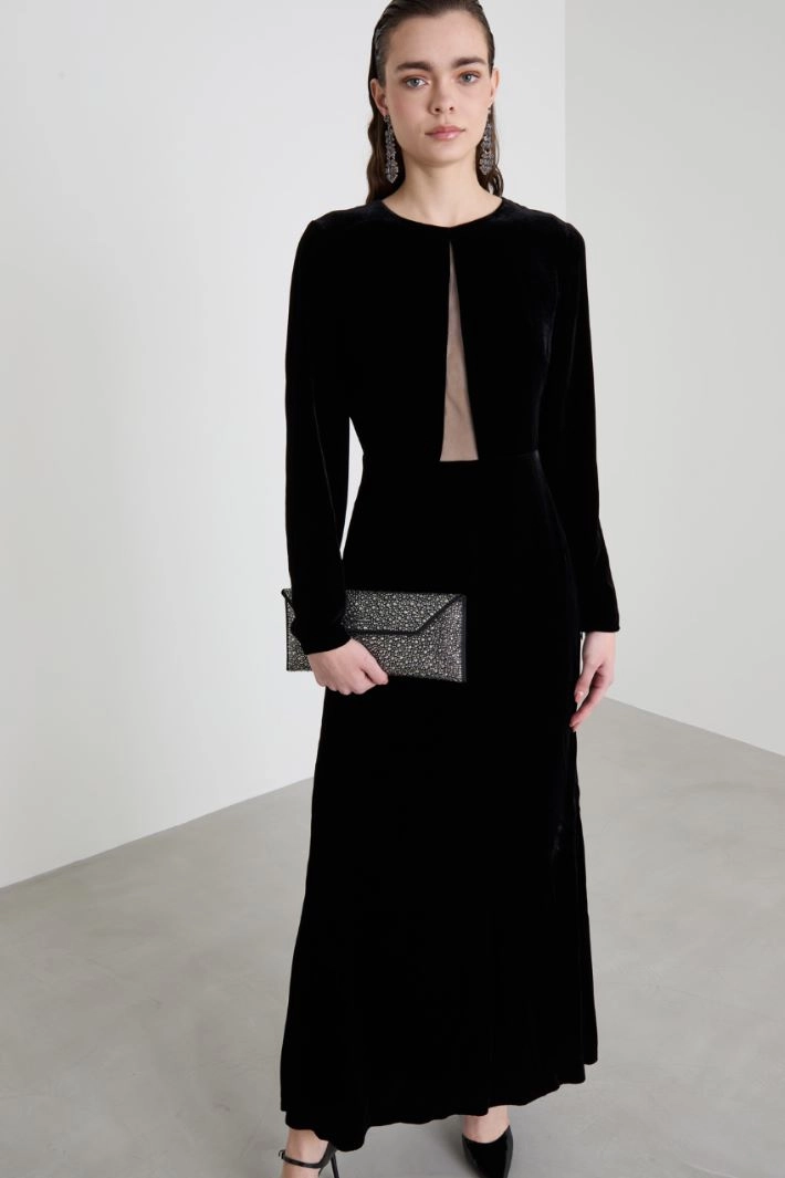 Long slightly flared dress in viscose and silk velvet, with a round neckline, geometric tulle neckline, and long sleeves with invisible zip at the bottom. Invisible zip fastening at the center back.