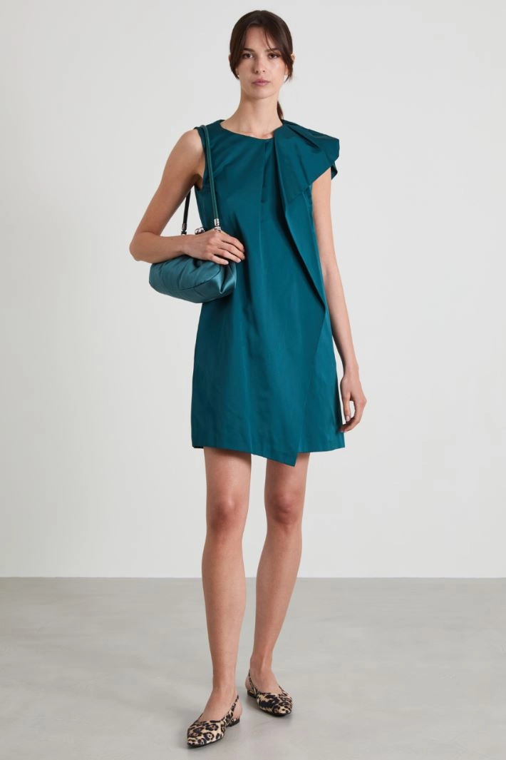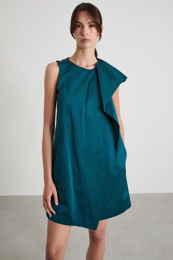 Short straight-fit dress in cotton blend fabric with an iridescent finish, featuring a crew neck, asymmetrical ruffle motif on the shoulder and inset side pockets. Invisible zip fastening on the back. Lined.