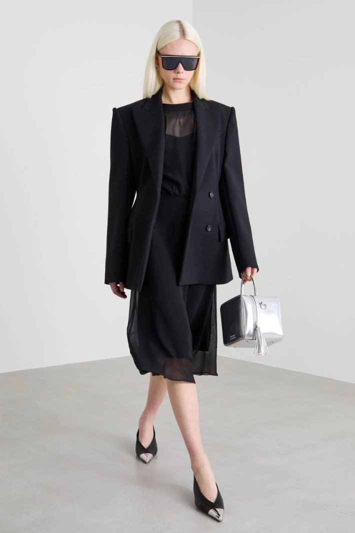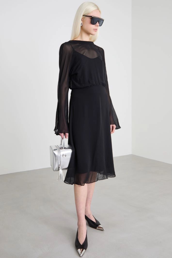 Loose-fit dress in pure silk georgette, with a boat neckline and crossover back, long sleeves with ruffles at the bottom and matching slip.