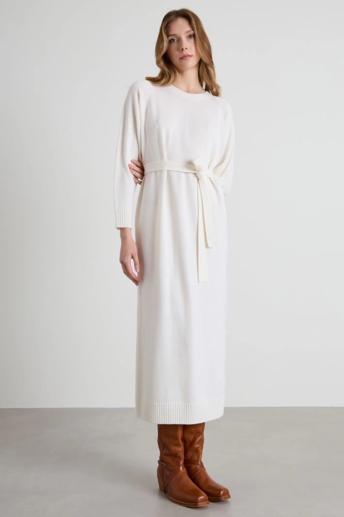 Straight-fit longuette dress in pure wool knit, with crew neck, long raglan sleeves and ribbed trim. Matching sash.