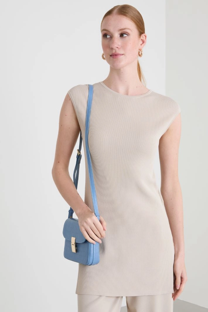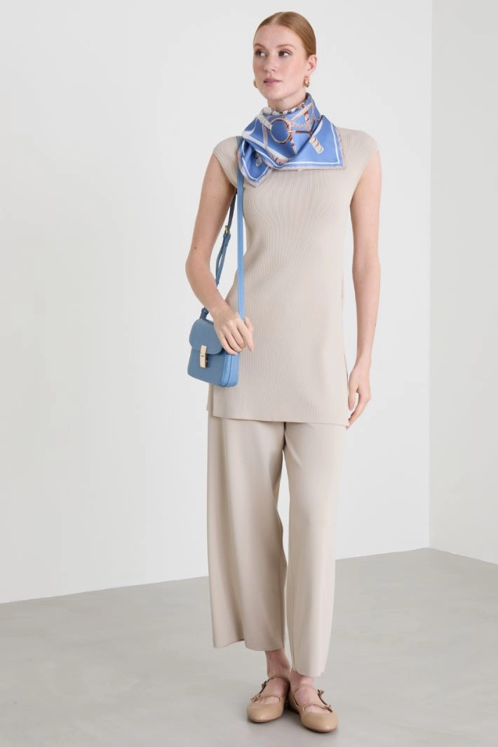 Loose-fit sweater in viscose crepe yarn finished with ribbed knit, crew neck, low set-in sleeves and side slits at the hem.
