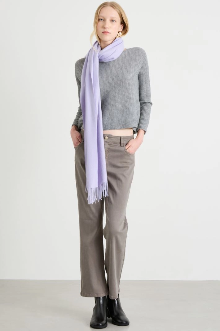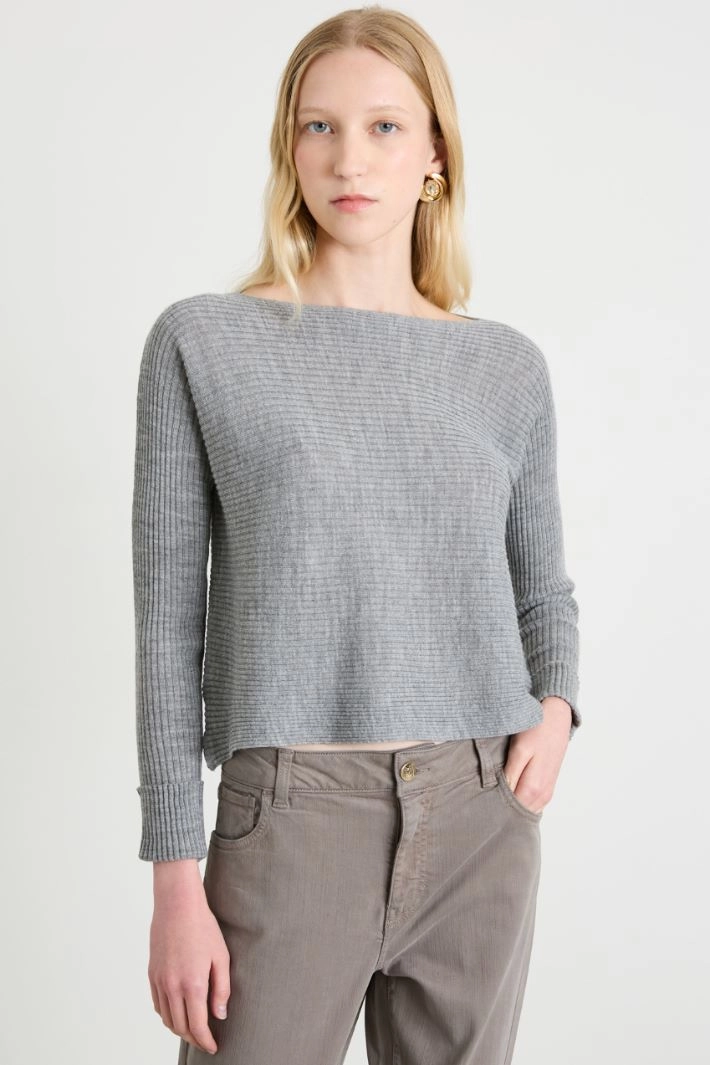 Regular-fit sweater in wool blend yarn, with horizontal ribbing, a boat neckline and long kimono sleeves with turn-ups.