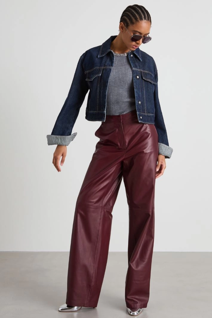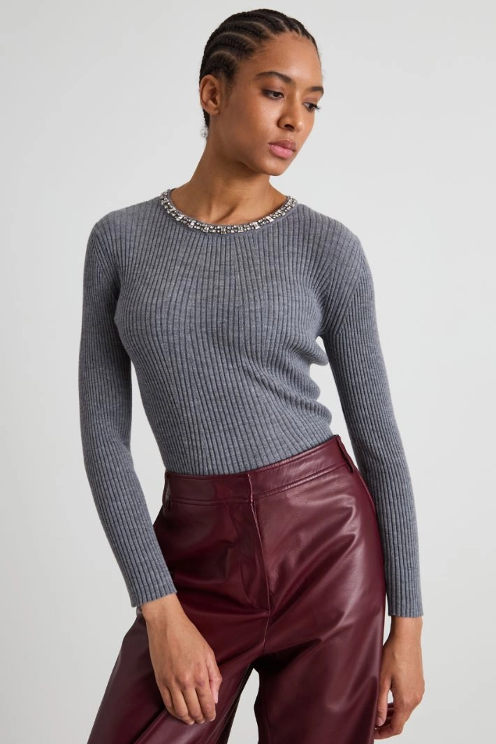 Fitted sweater in pure ribbed wool yarn, with a crew neckline finished with embroidered stones and long sleeves.