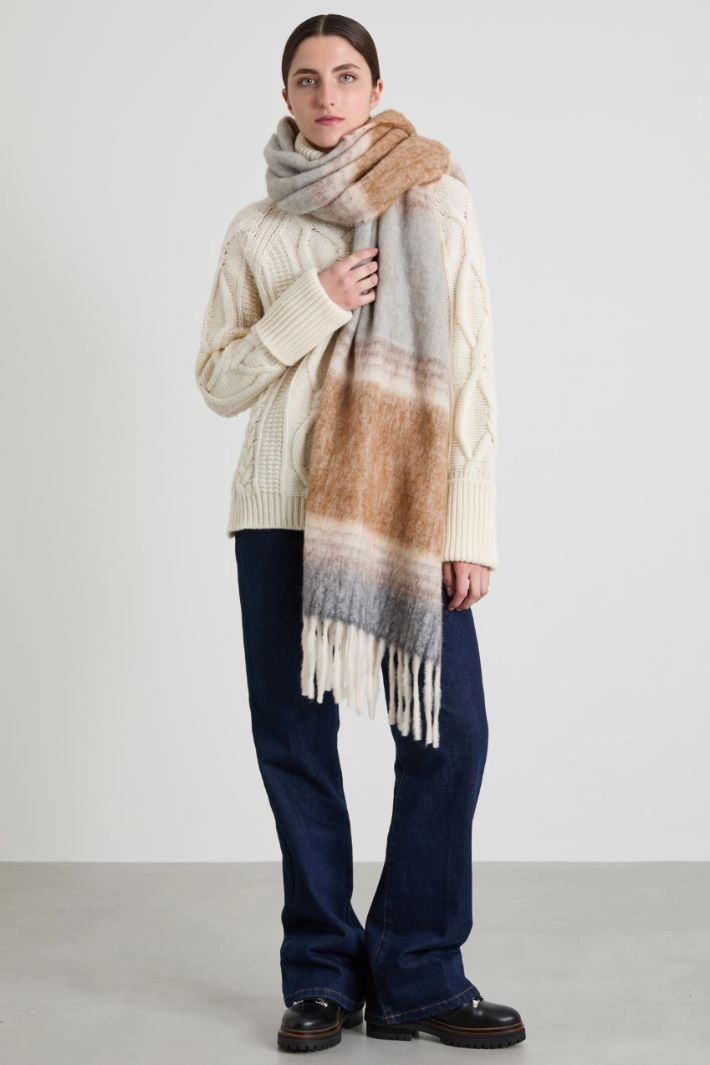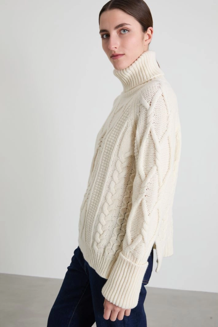 Loose-fitting sweater in pure wool yarn, with cable knit, high turn-up collar, long raglan sleeves and side slits at the bottom of the garment. Ribbed edges.