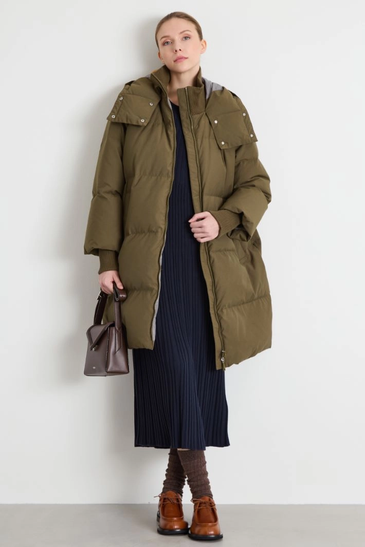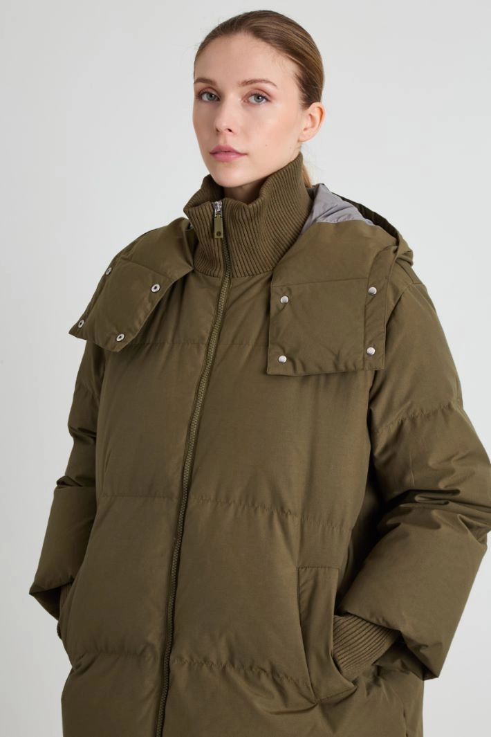 Straight-fit down jacket in technical cotton blend fabric, with quilted pattern and stretch viscose blend ribbed knit inserts. Model with hood, long sleeves, side welt pockets and double-slider zip fastening.