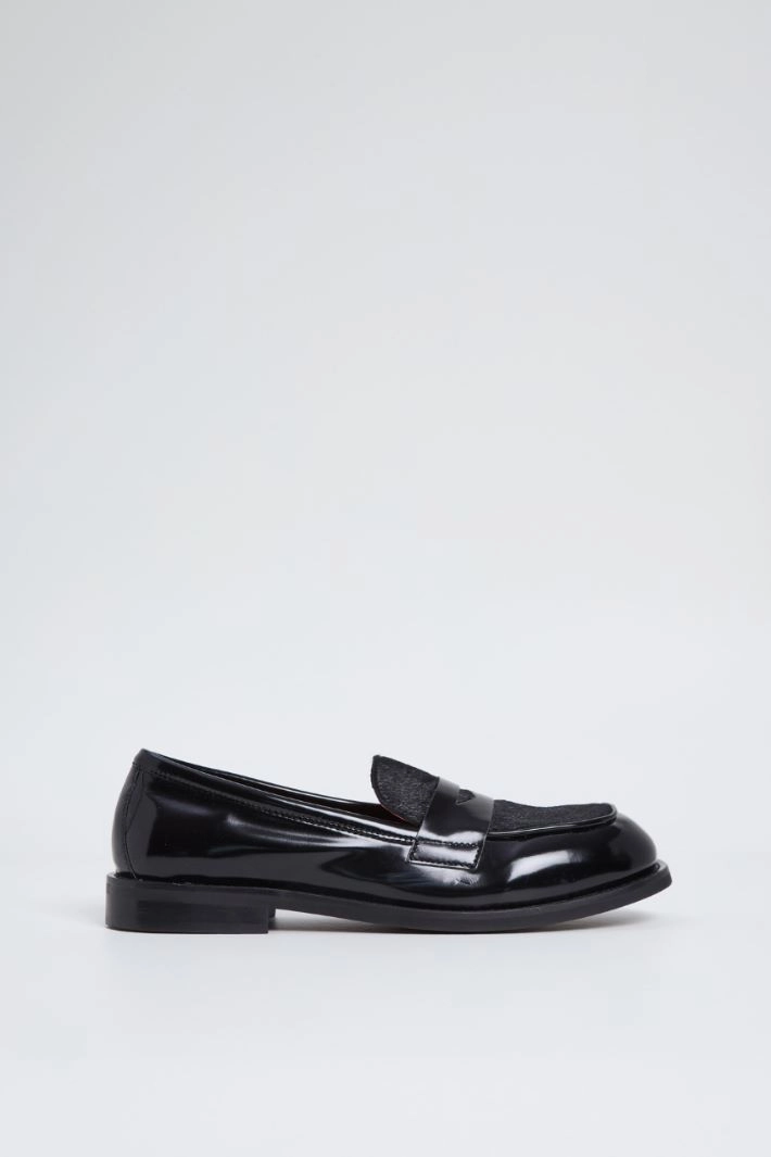 Faux leather moccasins with pony skin insert, square toe and band detail on the front. Rubber sole.