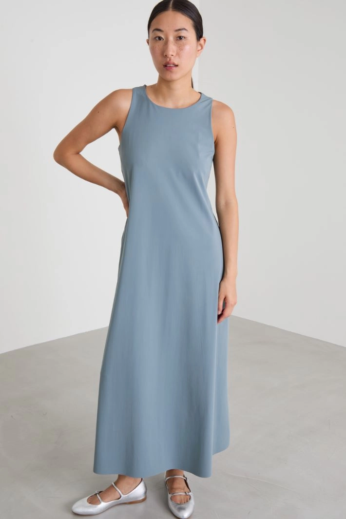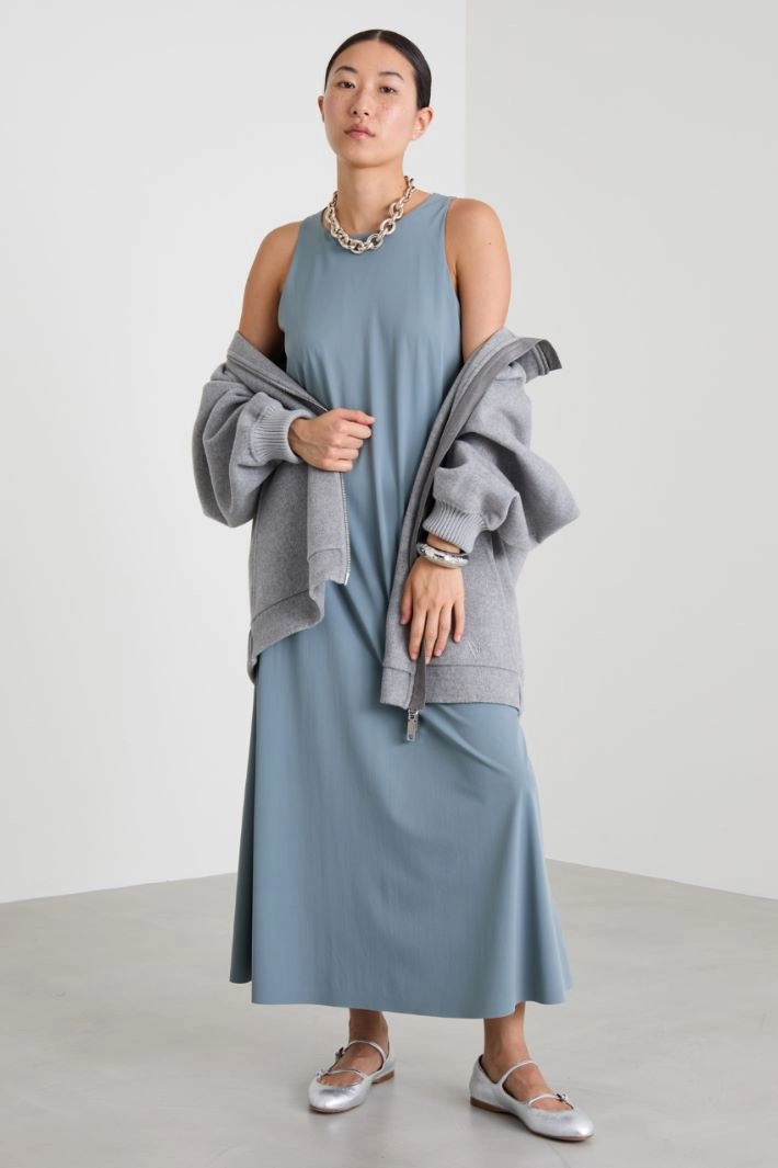 Flared dress in stretch technical jersey, with round neckline, sleeveless and side pockets inserted in the seam. Semi-lined.