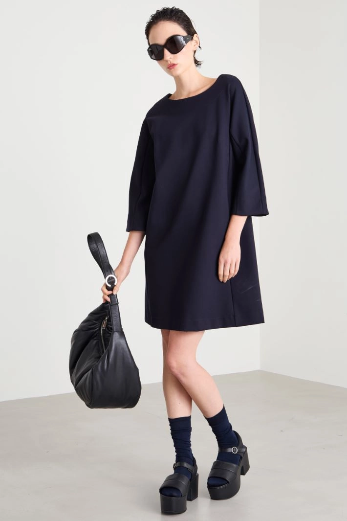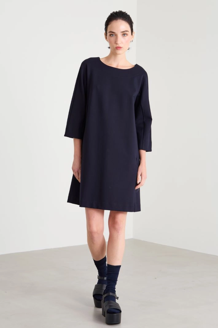 Straight-cut dress in compact viscose-blend jersey, with rounded neckline, three-quarter sleeves and pockets sewn into the sides. Invisible zip fastening on the back.
