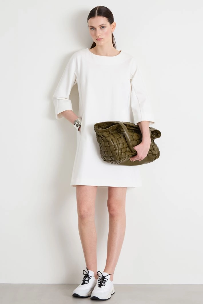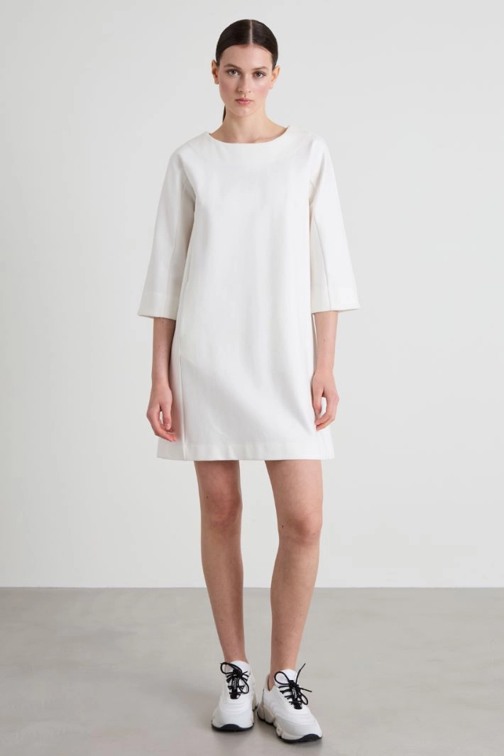 Straight-cut dress in compact viscose-blend jersey, with rounded neckline, three-quarter sleeves and pockets sewn into the sides. Invisible zip fastening on the back.