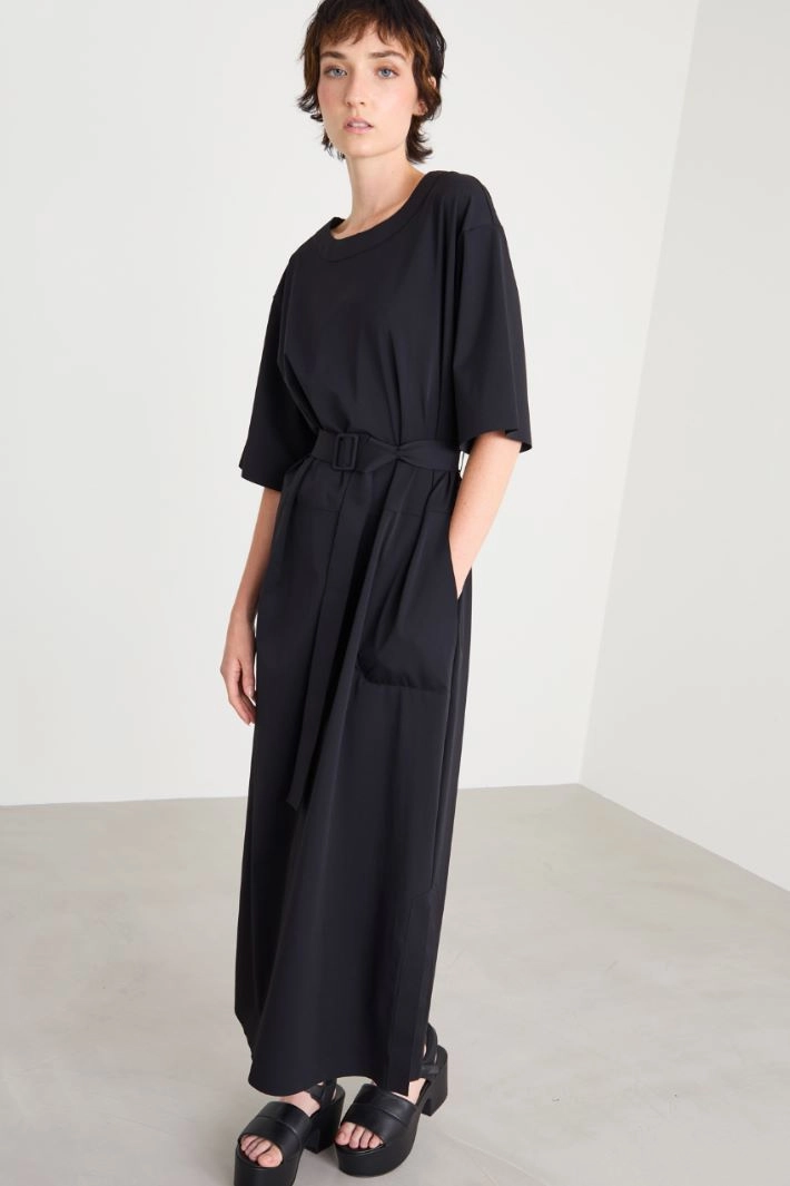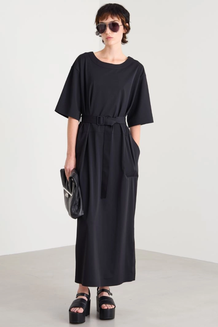 Straight-cut in technical jersey, with round neckline, elbow-length sleeves, French pockets, side slits at the bottom and matching belt.