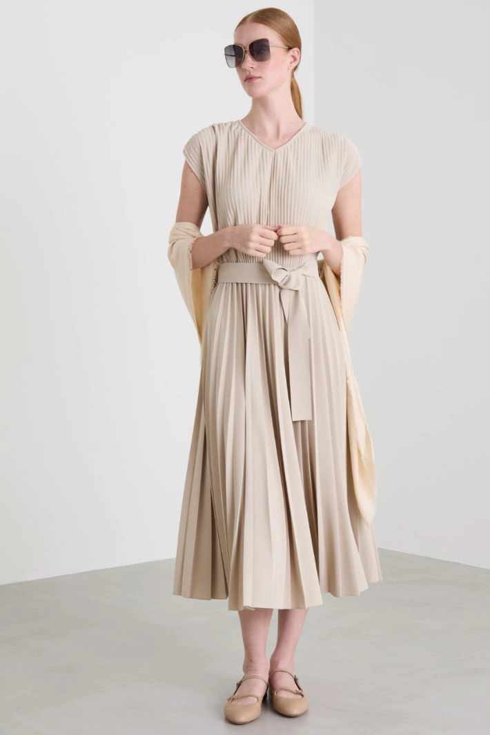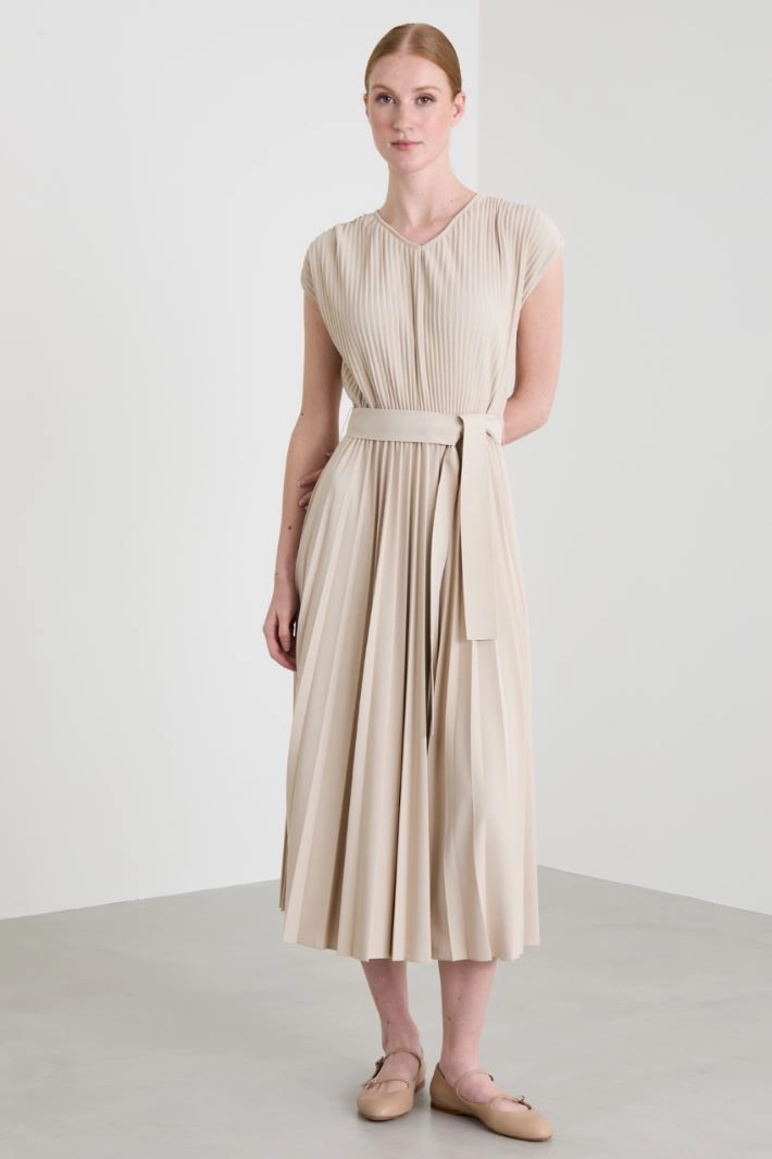 Loose-fit midi dress in pleated jersey, V-neck, low-cut cap sleeves and matching belt.