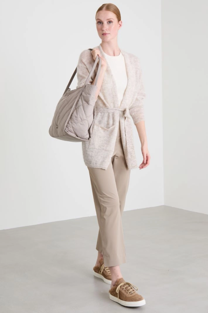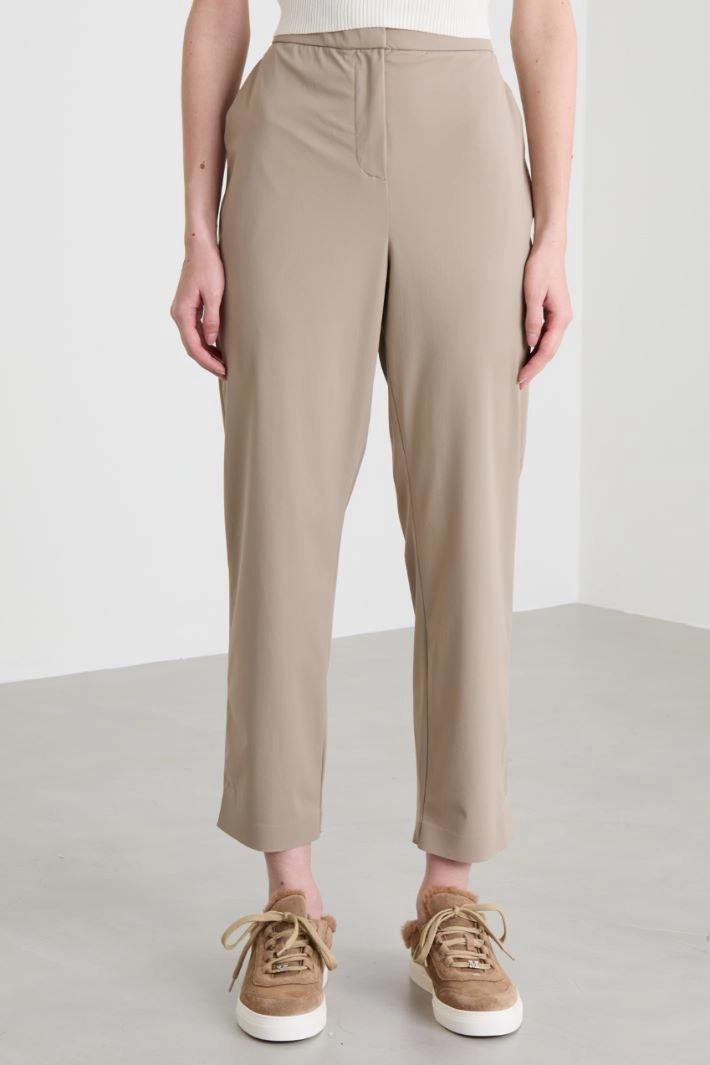 Cigarette trousers in technical jersey, with elastic waistband and French pockets. Hidden fastening with zip, button and hooks.