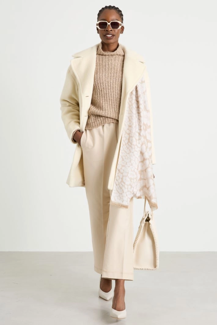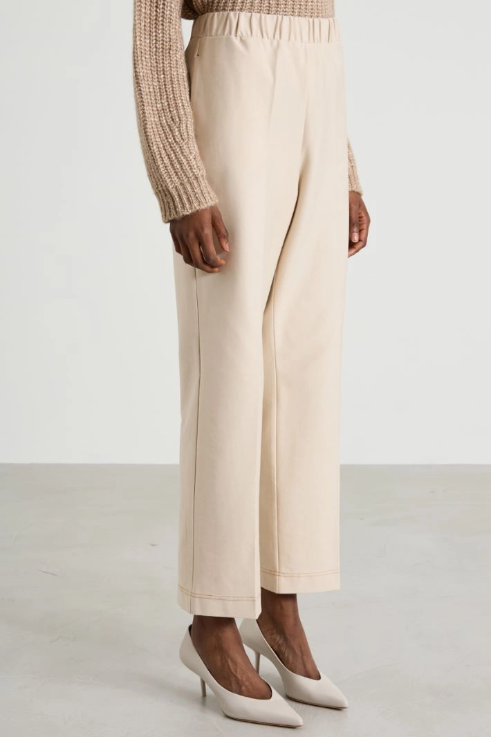 Straight-fit trousers in stretch cotton blend denim-effect jersey, with elasticated waistband, side pockets and pressed crease.