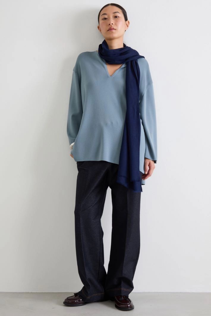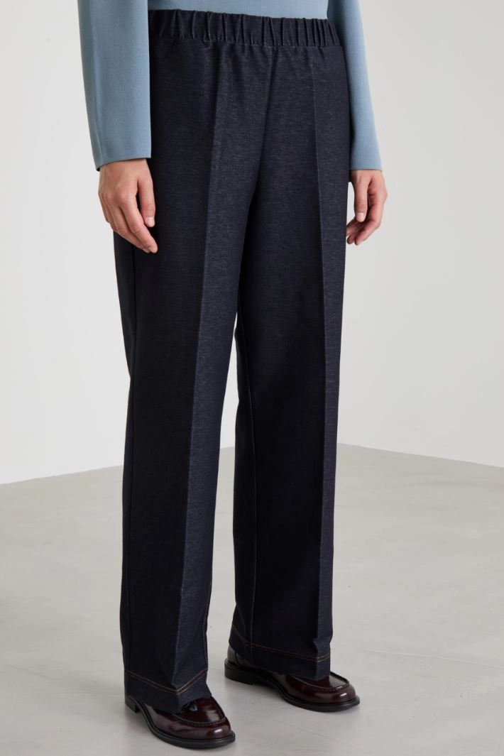 Straight-fit trousers in stretch cotton blend denim-effect jersey, with elasticated waistband, side pockets and pressed crease.