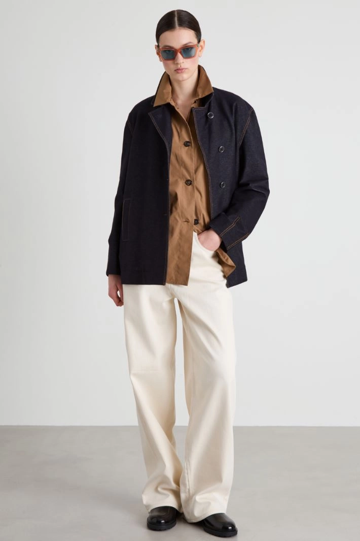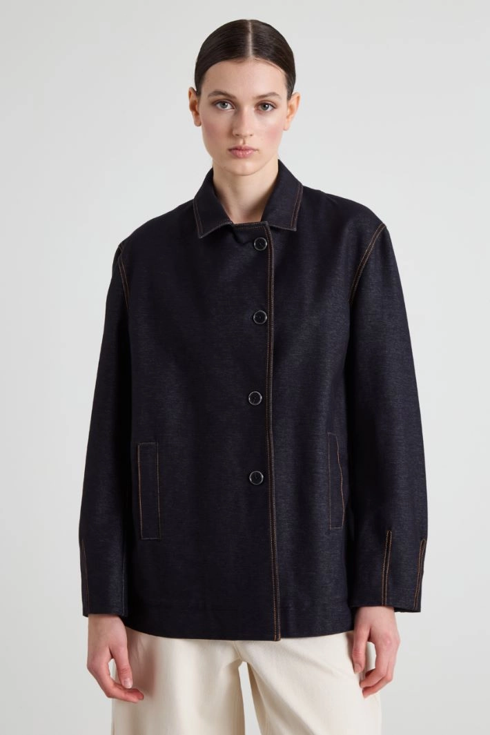 Straight-fit blazer in stretch cotton blend denim-effect jersey, with lapel collar, long sleeves, side welt pockets and single-breasted button fastening. Unlined.
