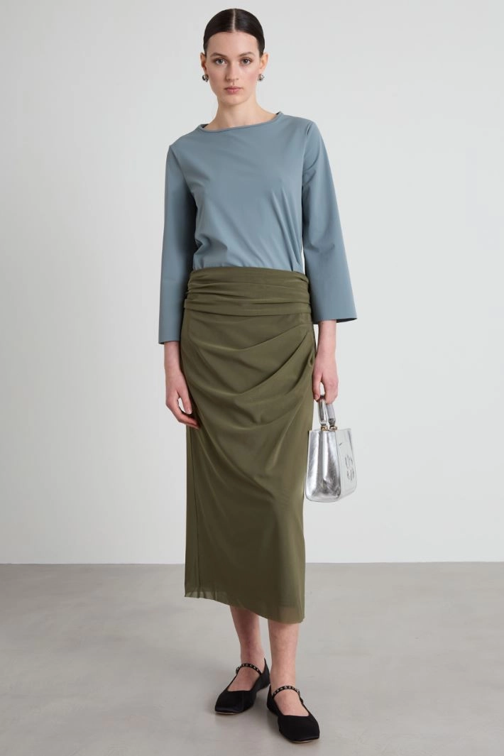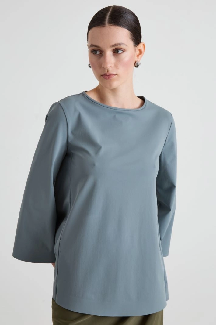 Flared blouse in stretch technical jersey, with round neckline and three-quarter sleeves.