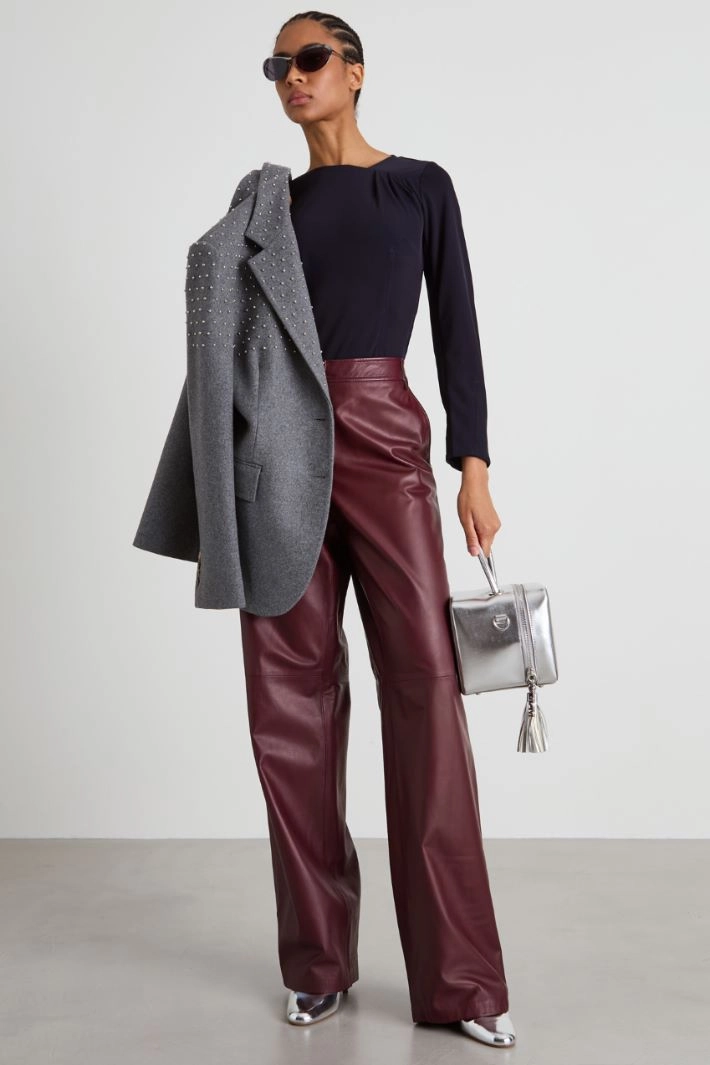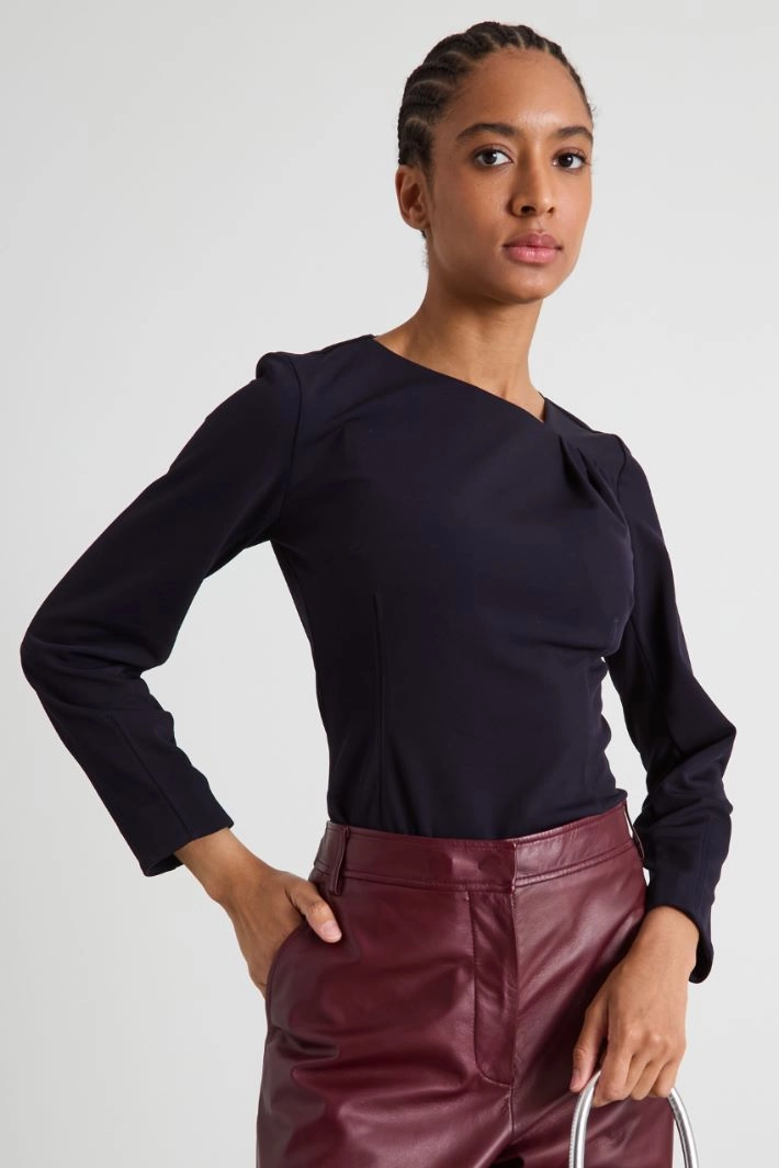 Fitted T-shirt in flowing jersey, with an asymmetrical neckline creating a pleated pattern and long sleeves.