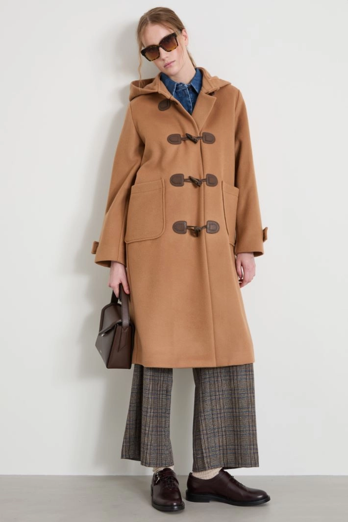 Long straight-cut duffle coat in wool blend cloth, with hood, long sleeves with wrist strap, side patch pockets and fastening with toggles. Unlined.