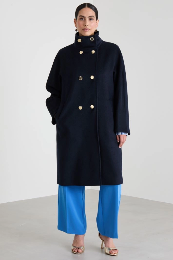 Straight-fit coat in pure wool sable drap, with topstitching, high collar, long sleeves and side welt pockets. Double-breasted fastening with metal buttons. Lined.