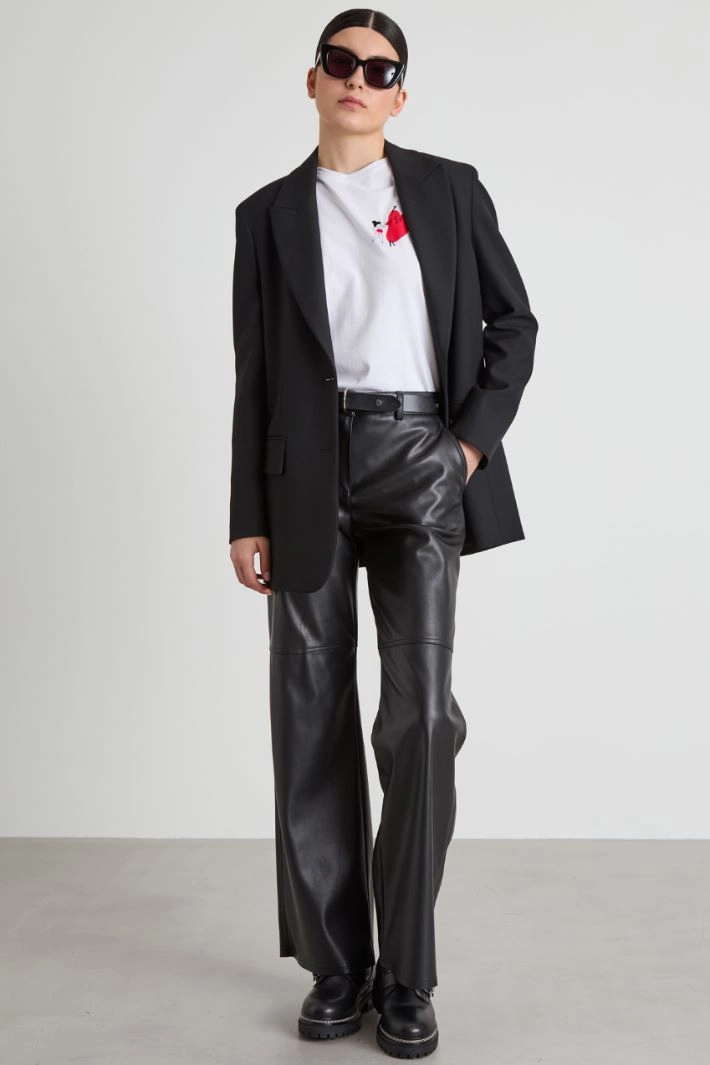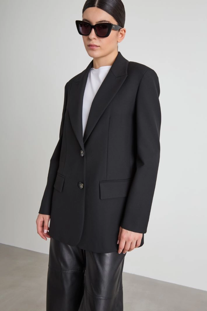 Straight-fit blazer in stretch viscose blend batavia, with lapel collar, long sleeves with slits, flap pockets and slit on the center back. Button fastening. Lined.