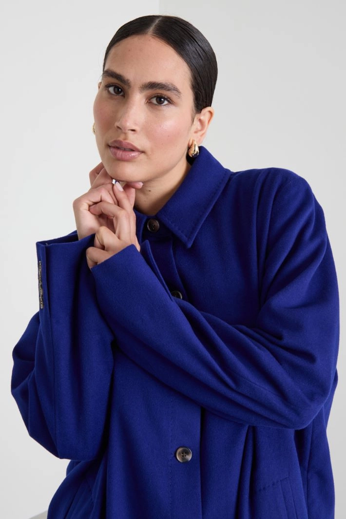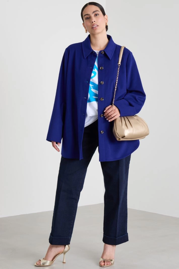 Straight-fit shirt-style coat in pure wool drap, with classic collar, long sleeves, side welt pockets and side slits. Single-breasted button fastening. Unlined.